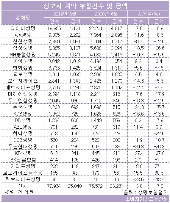 보험 계약 부활 금액도 2조3231억 원으로 전년 동기 2조5040억 원 대비 7.2% 감소했다.
