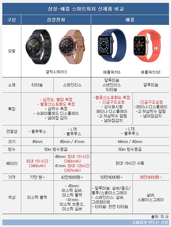 삼성전자의 ‘갤럭시워치3’는 심전도·혈압 및 혈중 산소포화도 측정이 가능한 것이 가장 큰 특징이다. 애플의 ‘애플워치6’는 혈중 산소포화도 측정과 긴급구조요청 기능을 내세웠다.
