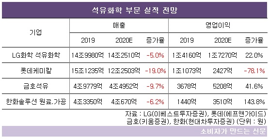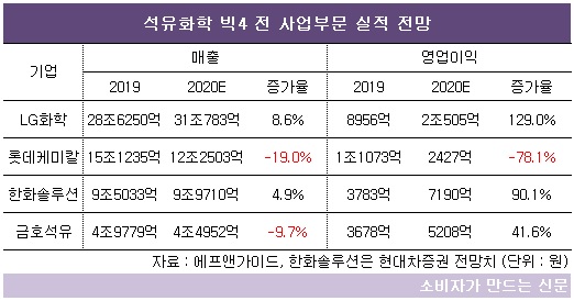 다만 유가 하락 영향으로 롯데케미칼(대표 신동빈·김교현·임병연·이영준)을 제외한 LG화학(대표 신학철), 한화솔루션(대표 이구영·김희철·류두형), 금호석유화학(대표 박찬구·문동준)은 영업이익이 크게 늘 것으로 예상된다.