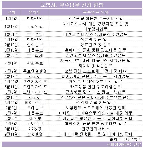 금융감독원에 따르면 올해 9월18일까지 16개의 보험사가 21건의 부수업무를 신청했다. 연간 부수업무 신청건수가 2018년 10건, 2019년 6건에 불과했던 것에 비해 올해 폭발적인 증가세를 보이고 있다.