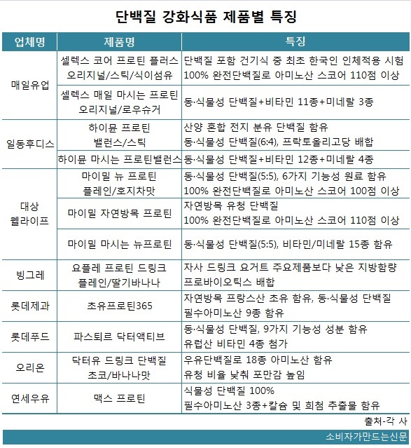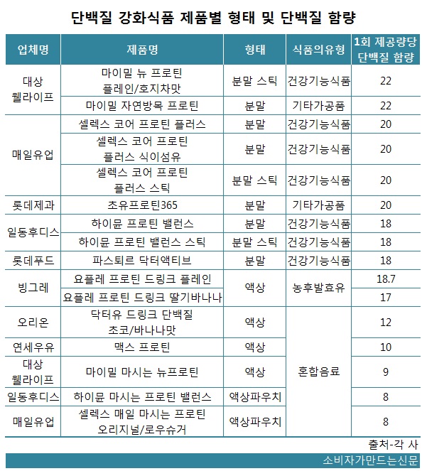 매일유업의 셀렉스 코어 프로틴 플러스/스틱/식이섬유 3종과 롯데제과 헬스원의 초유프로틴365도 1회 제공량당 단백질 함량이 20g으로 높았다. 일동후디스 '하이뮨 프로틴 밸런스'도 18g의 단백질을 함유하고 있다.