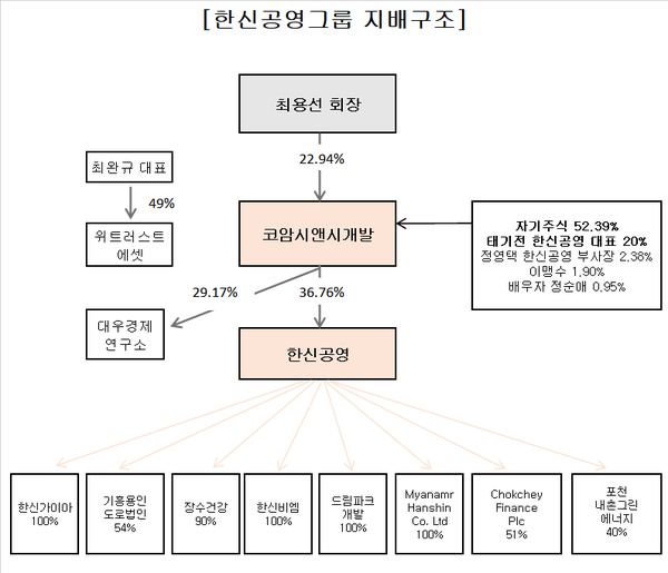 그룹 내 유일 상장사인 한신공영의 시가총액은 9월 18일 기준 약 1655억 원이며 최대 주주는 36.76%의 지분을 가진 코암시앤시개발이다. 코암시앤시개발은 최용선 한신공영 회장(76)과 동향 출신의 태기전 한신공영 각자대표(72)가 지분을 각각 나눠갖고 있다.