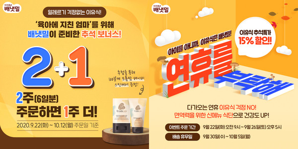 아이배냇 관계자는 “추석을 맞아 육아로 지친 엄마들에게 혜택을 제공해 드리고자 이번 이벤트를 진행한다“며 “아이먹거리 전문가들의 노하우를 담은 신선 배달이유식 ‘배냇밀’의 체계적이고 건강한 이유식과 함께, 엄마와 아이, 가족들이 모두 즐겁고 건강한 추석 명절을 보내시길 바란다”고 말했다.