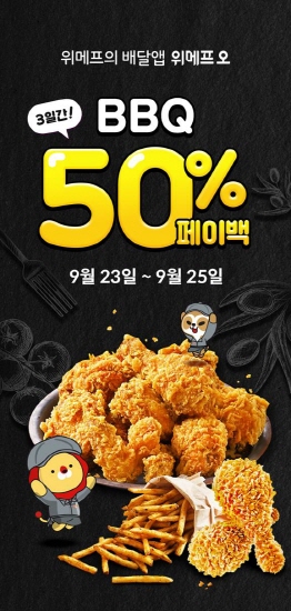 이번 행사는 BBQ 모든 메뉴를 대상으로 결제 금액(배달료 제외)의 50%를 위메프오 포인트로 돌려준다. 이벤트는 신용카드 및 유료포인트 ‘바로 결제’ 주문으로만 참여할 수 있다.