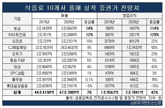 금융감독원 전자공시시스템과 금융정보업체 에프앤가이드에 따르면 국내 식음료 10개사의 올해 연간 매출액은 총 47조7089억 원으로 전년 대비 7% 증가할 전망이다. 영업이익은 총 2조7841억 원으로 42%나 늘어날 것으로 분석됐다.