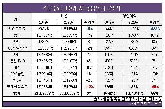 한편 지난 상반기에도 대부분의 식음료 기업은 매출과 영업이익이 동반 성장하는 등 호조세를 보였다. 10개사의 상반기 매출 총계는 전년 동기 대비 9% 증가한 23조857억 원으로 나타났다. 영업이익은 1조4041억 원으로 지난해 8442억 원에서 66%나 성장했다.