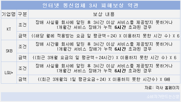 통신사들은 이용자의 고의나 과실이 없는 사유로 인터넷 장애가 확인될 경우 이용약관에 의거 보상하고 있다. 손해배상 조건 및 배상금액 산식은 3사 거의 동일하다.