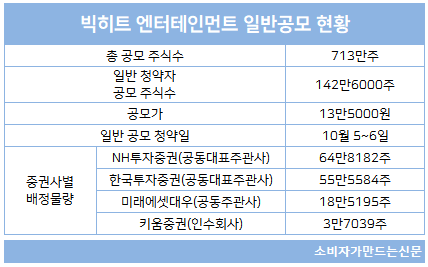 빅히트엔터테인먼트 일반인 대상 공모주 청약은 5일과 6일 이틀간 총 4개 증권사를 통해 진행된다. 공모주 총합은 713만주이지만 일반인에게 배정된 물량은 그 중 20% 수준인 142만6000주, 그 중에서도 공모주 청약을 받는 4개 증권사 모두 배정 물량이 다르다.