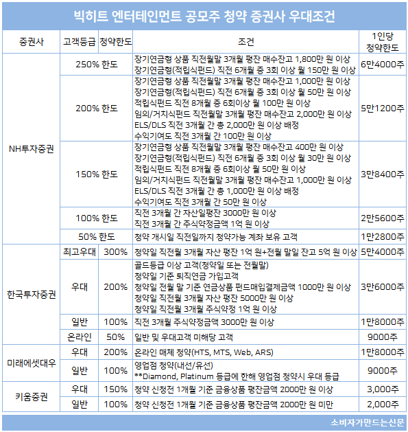 배정물량이 상대적으로 적은 미래에셋대우와 키움증권은 우대/일반 고객으로 나눠 청약한도가 제공된다. 미래에셋대우는 온라인 매체로 청약하는 고객에게 모두 청약한도 200%가 제공돼 1인 당 최대 1만8000주를 청약할 수 있고 키움증권은 청약신청전 1개월 기준 금융상품 평잔 2000만 원 이상이면 3000주까지 청약 가능하다.
