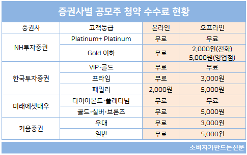 다수 증권사들이 온라인 매체를 통한 청약 시 수수료를 무료로 하고 있지만 오프라인의 경우 고객 등급에 따라 청약 1건 당 3000~5000원 정도 수수료를 받는다.