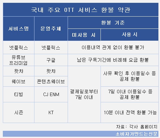 소비자가만드는신문이 유튜브 프리미엄, 넷플릭스, 웨이브, 왓챠, 티빙, 시즌 등 국내 주요 OTT 대상으로 환불 정책을 조사한 결과 넷플릭스를 제외한 6개 서비스는 이용내역이 없는 경우에 한해 7일 이내 환불이 가능한 것으로 조사됐다.