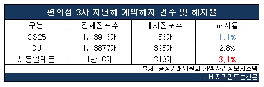 CU는 계약해지율이 2.8%, GS25는 1.1%로 집계됐다.