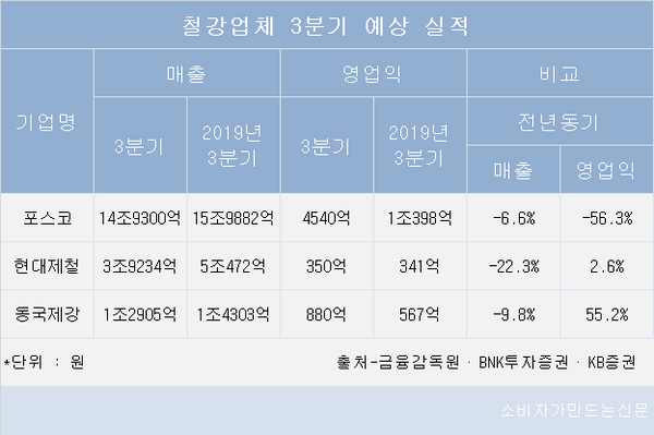 현대제철(대표 안동일)과 동국제강(대표 장세욱·김연극)이 3분기에 매출 감소에도 불구하고 수익성을 회복할 것으로 전망된다. 포스코(대표 최정우)는 지난해 3분기에 비해 매출과 영업이익이 모두 감소하지만, 올해 2분기와 비교하면 매출과 영업이익이 모두 증가할 것으로 보인다.