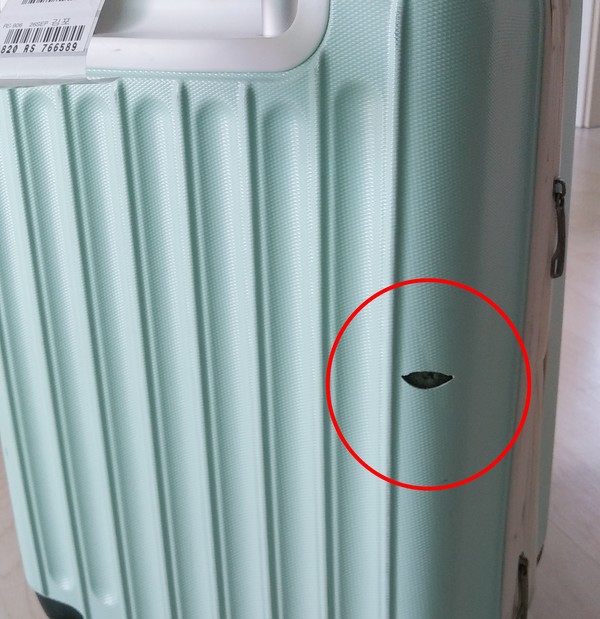 수원시 권선구에 사는 이 모(여)씨는 지난달 26일 제주에서 김포로 오는 에어서울 항공편을 이용하며 캐리어를 기내에 싣지 않고 별도 수화물로 맡겼다. 집에 도착해 물건을 정리하던 중 뒤늦게 캐리어에 구멍이 뚫린 것을 발견했다고.
