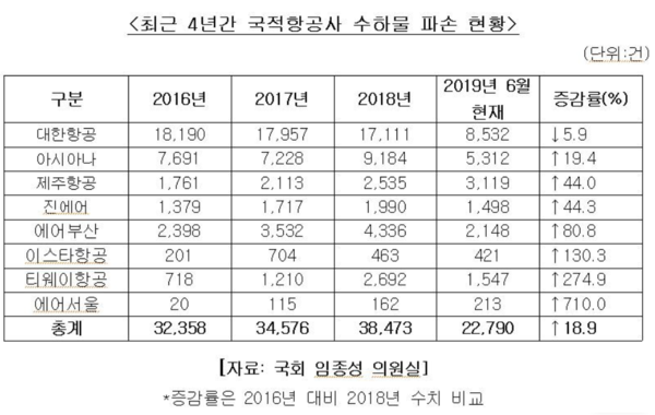 “2019년 10월 첫 취항 이후 신규 취항 및 편수가 늘었기 때문에 파손 건수가 많아진건 사실”이라며 “민원이 접수되면 검토 후 적절한 보상을 해드릴 수 있도록 최대한 노력하고 있다”고 강조했다.