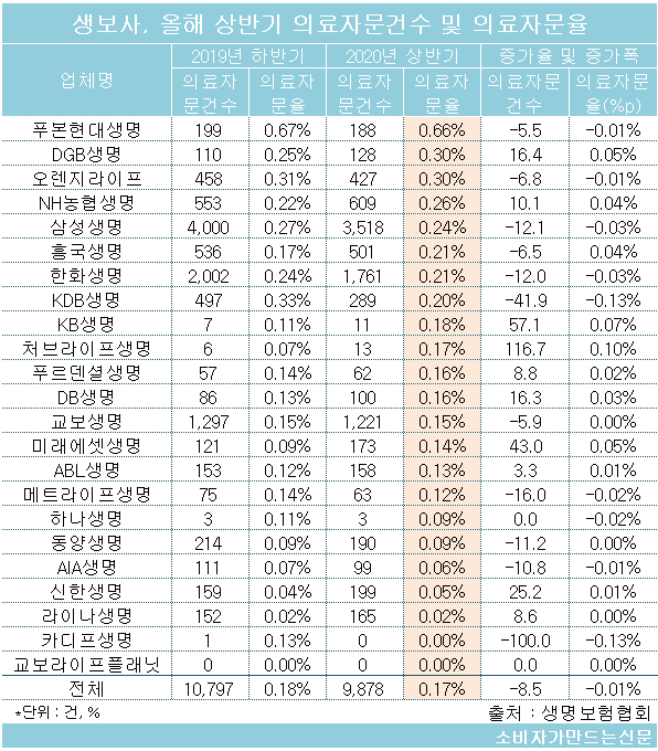올 상반기 기준 의료자문율은 모든 생보사가 1% 미만이었다. 푸본현대생명이 188건의 의료자문을 실시해 의료자문율 0.66%로 가장 높았다. DGB생명과 오렌지라이프는 0.3%를 기록했으며 농협생명 역시 0.26%에 불과했다.