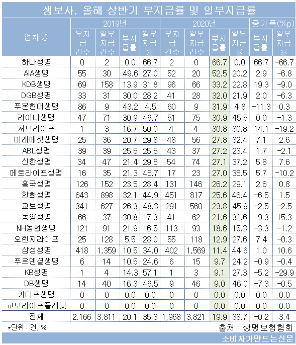 올해 상반기 전체 생보사의 부지급률은 19.9%로 지난해 하반기 20.1%에 비해 0.2%포인트 떨어졌지만 일부지급률은 38.7%로 3.4%포인트 올랐다.