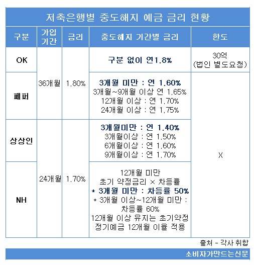 14일 업계에 따르면 현재 OK저축은행과 페퍼저축은행, 상상인저축은행, NH저축은행 등 주요 저축은행들은 3개월 미만 중도해지 시에도 이자를 지급하는 중도해지 예금상품을 운영 중이다.