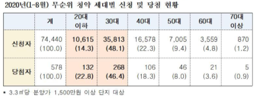 11일 국토교통부가 국민의힘 김상훈 의원에게 제출한 ‘2020년 1~8월간 무순위 청약 실시 현황’에 따르면 올해 전국 아파트 3.3㎡당 분양가 1500만 원 이상 전국 12곳 단지의 무순위 청약 지원자 7만4440명 중 30대가 35,813명(48.1%)로 가장 큰 비중을 차지했다. 20대 이하 또한 1만615명(14.3%)에 이르렀다.