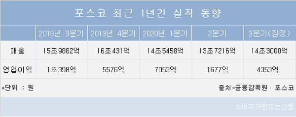 SK증권 보고서에 따르면 연결 재무제표 기준으로 포스코는 3분기에 매출 14조3000억 원, 영업이익 4353억 원을 기록할 전망이다. 2분기에 비해 매출은 4.2%, 영업이익은 159.6% 증가하지만, 전년 동기와 비교하면 매출은 10.6%, 영업이익은 58% 줄 것이라는 분석이다.