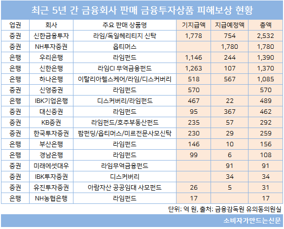 국회 정무위원회 소속 유의동 국민의힘 의원실이 금융감독원으로부터 받은 '최근 5년 간 금융투자상품 투자자 피해에 대한 보상지급내역'에 따르면 지난 2016년 1월부터 올해 8월 말까지 은행과 증권사가 판매한 금융투자상품 문제로 피해 소비자들에게 선지급했거나 지급 예정인 금액은 1조666억 원 이었다.