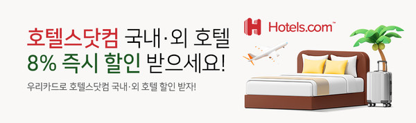 URL복사 기사공유하기 스크랩 프린트 메일보내기 글씨키우기 우리카드가 호텔스닷컴과 손잡고 숙박료 즉시할인 이벤트를 진행한다고 15일 밝혔다. 우리카드로 호텔스닷컴에서 숙박을 예약하면 이용 금액의 8%를 즉시할인 받을 수 있다. 단, 법인 및 기프트카드는 제외한다. 이벤트는 10~12월 세 달간 진행하며, 국내외 주요 지역 호텔을 대상으로 진행된다. 할인을 받기 위해서는 우리카드 홈페이지에 연결된 링크를 통해 접속해 결제하면 된다. [소비자가만드는신문=이예린 기자] 저작권자 © 소비자가 만드는 신문 무단전재 및 재배포 금지 이예린 기자 다른기사 보기 URL복사 기사공유하기 주요기사 블프·코세페 등 할인 행사 몰린 11월, 택배 민원 54% 급증 최태원 SK 회장 "AI 발전, 사회적가치 측정 한계 해결할 전환점 될 것" 농협, 고위직 선출 과정에서 외부기관 활용한다... 경영혁신 방안 추진 정윤경 경기도의회 부의장, '도시농부 청소년방과후아카데미 옥상텃밭 활동 보고회' 참석 넥슨 네오플 노사, 임단협 잠정합의...넥슨코리아와 동일한 수준 신한·KB·하나금융, ESG등급 'A+'... 중징계 받은 증권사는 줄줄이 하락