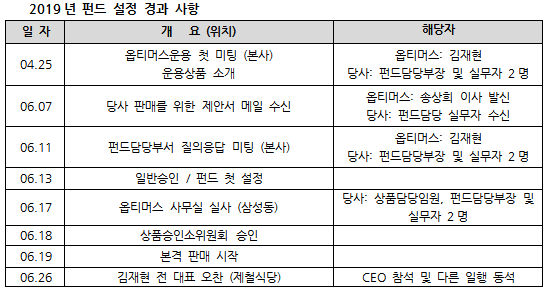 더욱이 점심자리가 있었던 2019년 6월 26일은 이미 옵티머스 펀드 제안서를 받고 내부 검토 후 승인을 거쳐 판매가 이뤄지기 시작한 지 2주일이 지난 시점으로 옵티머스 펀드 판매를 위해 김재현 옵티머스운용 대표가 로비활동을 펼칠 이유가 없다는 것이다.