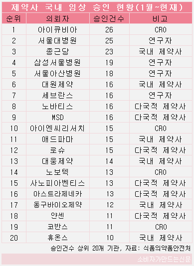 국내 제약사 가운데는 종근당의 임상 승인건수가 23건으로 가장 많았다. 대원제약이 16건, 애드파마가 15건, 대웅제약(대표 전승호)이 14건, 동구바이오제약(대표 조용준)이 12건으로 그 뒤를 이었다.