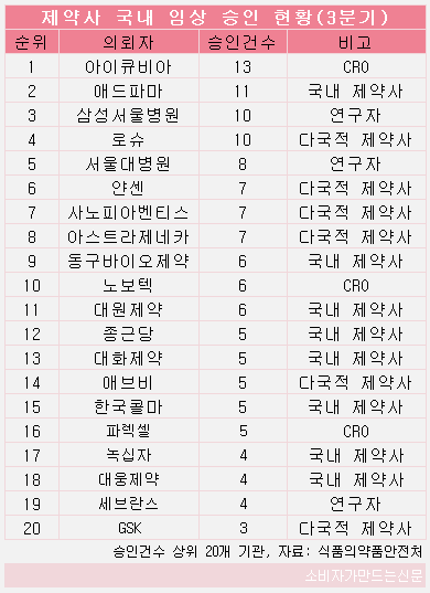 3분기만 놓고 보면 연구개발 수탁전문기업(CRO)인 한국아이큐비아가 13건으로 가장 많았고 국내 제약사 중에서는 애드파마 11건으로 제일 많았다. 이밖에 삼성서울병원(연구자 임상) 10건, 한국로슈 10건, 서울대병원(연구자임상) 8건, 한국얀센과 사노피·아벤티스 코리아, 한국아스트라제네카 7건을 기록했다.