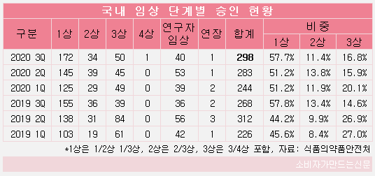 국내 제약업계 관계자는 "3상은 실패 확률도 높을 뿐더러 막대한 비용 투입이 불가피하다. 충분한 자금력이 뒷받침돼야 한다"면서 "1상 건수가 증가하고 있는 것은 의약품 개발과 상업화 의지가 활발해지는 고무적 현상으로 볼 수 있을 것"이라고 말헀다.