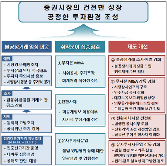무자본 M&A에 대해서는 모니터링 시스템을 구축하고 기업 인수자금 관련 공시의무를 강화하며 대량보유 보고의무(5%룰) 위반에 대한 과징금을 현실화할 예정이다.