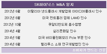 SK하이닉스의 가장 최근 인수건은 2014년 6월 벨라루스의 소프텍 펌웨어사업부다. 2012년에는 미국 컨트롤러 업체 LAMD를 샀다. 또 종속회사를 통해 낸드플래시 개발업체 아이디어플래시도 인수했다. 당시 SK하이닉스의 인수는 거의 대부분 SSD 컨트롤러 기술 강화를 위해 이뤄졌다.