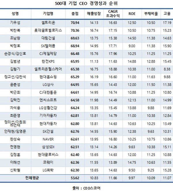21일 기업평가사이트 CEO스코어(대표 박주근)가 국내 500대 기업 CEO(오너 포함) 159명의 지난해와 올 상반기 경영성적을 점수로 환산한 결과 평균 53.62점으로 집계됐다.