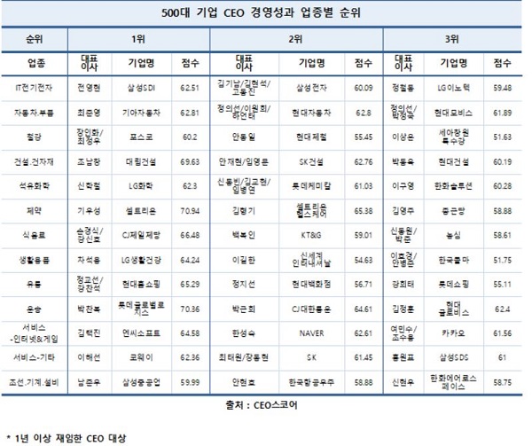 업종별 경영점수가 가장 높은 CEO는 △IT전기전자(전영현 삼성SDI 대표, 62.51점) △자동차‧부품(최준영 기아차 대표, 62.81점) △철강(최정우‧장인화 포스코 대표, 60.2점) △건설 및 건자재(조남창 대림건설 대표, 69.63점) △석유화학(신학철 LG화학 대표, 62.3점) △제약(기우성 셀트리온 대표, 70.94점) △식음료(손경식‧강신호 CJ제일제당 대표, 66.48점) △생활용품(차석용 LG생활건강 대표 64.24점) △유통(정교선‧강찬석 현대홈쇼핑 대표, 65.29점) △운송(박찬복 롯데글로벌로지스 대표, 70.36점) △서비스(인터넷&게임)(김택진 엔씨소프트 대표, 64.58점) △서비스(기타)(이해선 코웨이 대표, 62.36점) △조선‧기계‧설비(남준우 삼성중공업 대표, 59.99점) 등이었다.