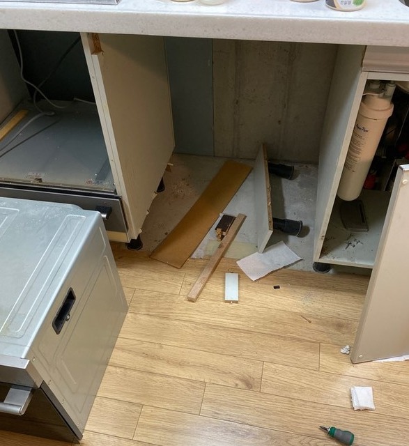 빌트인 제품을 설치하며 기사가 싱크대를 쇠톱으로 잘랐고 연결된 장까지 힘으로 뜯어내 결국 망가진 것이다. 하지만 설치기사는 뜯어진 문을 마무리도 하지 않고 "수리를 못할 것 같다"며 엉망인 상태로 방치한 채 가버렸다고.