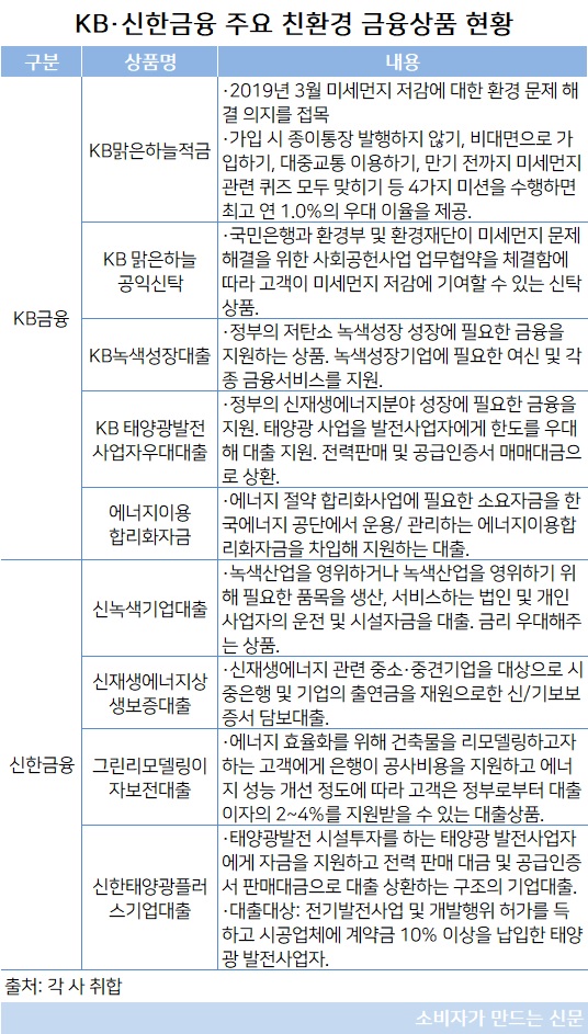 KB금융 관계자는 “친환경 사업 및 녹색산업 성장에 필요한 금융 지원을 확대하고 있다”며 “다양한 친환경 대출 상품의 개발을 통해 녹색금융 지원을 확대할 예정”이라고 밝혔다.