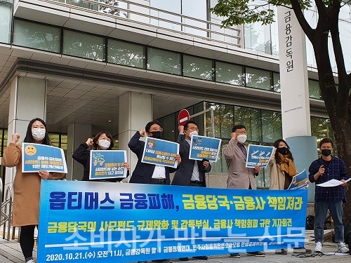 금융정의연대, 민주사회를위한변호사모임 민생경제위원회, 참여연대 경제금융센터 등 시민단체들은 21일 오전 서울 금융감독원 앞에서 기자회견을 열고 옵티머스 사태의 책임은 금융당국과 금융회사 모두에 있다고 밝혔다.