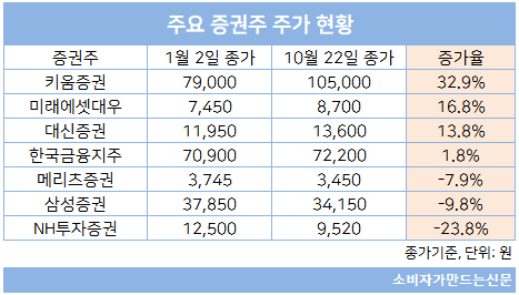 국내 10대 증권사 가운데 키움증권(대표 이현)과 미래에셋대우(대표 최현만·조웅기), 대신증권(대표 오익근)이 주가가 연초에 비해 두 자릿수 비율로 상승한 반면, NH투자증권(대표 정영채)과 삼성증권(대표 장석훈) 등은 주가가 큰 폭으로 떨어졌다.