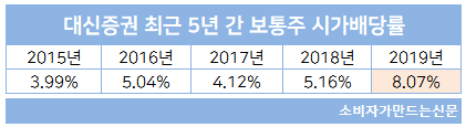 대신증권은 지난 2019 회계연도 기준 보통주 1주 당 1000원, 시가배당률은 8.1%를 기록하며 주주들에게 고배당을 실시했다. 당시 회사 측은 코로나 사태로 인해 주가가 급락함에 따라 주주가치를 지키기 위해 배당을 늘렸다고 밝힌 바 있다. 특히 대신증권은 22년 연속 현금배당을 실시하고 평균 5% 남짓 배당수익률을 기록해왔다는 점에서 고배당주로서 가치를 지켜가고 있다.