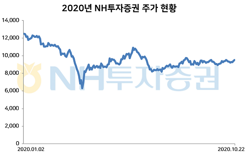 22일 종가 기준 NH투자증권 주가는 연초 대비 23.8% 하락한 9520원에 머물러있다. 연초 1만2000원 선을 유지하던 주가가 코로나 팬데믹 직후 6000원 대까지 추락하고 회복했지만 3분기 들어 8000~9000원 선에서 등락을 거듭하고 있는 상황이다.