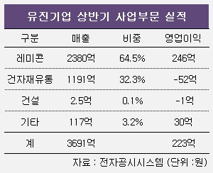 유진기업은 상반기 매출 3691억 원의 96.8%를 레미콘(64.5%)과 건자재유통(32.3%) 사업이 담당했다. 건자재유통과 건설은 영업 적자를 냈고, 레미콘만 수익을 냈다.