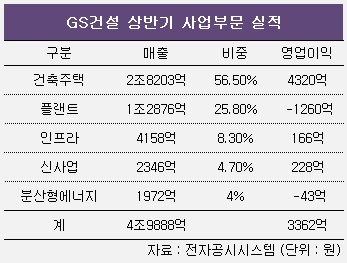 올 상반기 기준 GS건설 매출 4조9888억 원 중 56.5%가 건축·주택 부문에 치우쳐 있다. 플랜트사업(25.8%)을 더하면 비중은 82.3%로 높아진다. 영업이익은 사실상 대부분을 건축·주택이 담당한다. 매출의 큰 부분을 차지하는 플랜트도 상반기 큰 적자를 냈다.