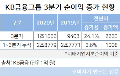 이밖에 KB금융의 핵심 계열사인 국민은행의 누적 당기순이익은 1조8824억 원으로 지난 2분기에 추가 대손충당금(세후 약 1150억 원)을 적립한 영향 등으로 전년 대비 6.2%(1243억 원) 감소했다.