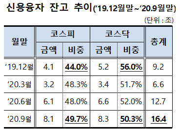 금융감독원에 따르면 올해 9월 말 기준 주식투자를 위한 신용융자잔고는 16.4조 원으로 연중 최고치를 유지하고 있다. 코스피 관련 신용잔고 비중은 작년 말 44%에서 9월 말 49.7%로 5.7% 포인트 상승했지만 코스닥 종목에 대한 신용잔고 비중은 같은 기간 56%에서 50.3%로 5.7% 포인트 떨어졌다.