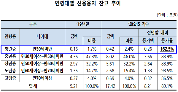 연령 별로는 모든 연령층의 신용융자 규모가 확대됐는데 특히 만 30세 미만 청년층 신용융자 증가율이 1600억 원에서 4200억 원으로 작년 말 대비 162.5% 늘어 가장 높은 증가율을 보였다.