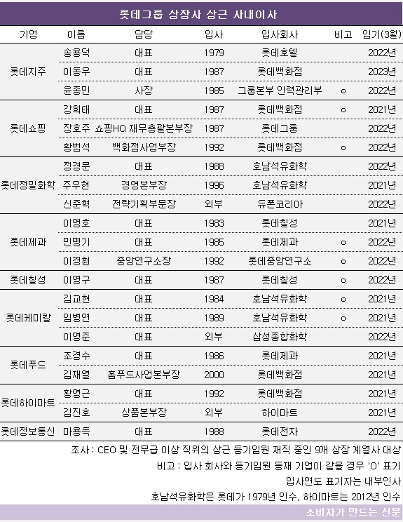 금융감독원 전자공시시스템에 따르면 롯데그룹 10개 상장사 중 법인대표 체제인 롯데리츠를 제외한 9곳 CEO와 사내이사(전무급 직위 이상)의 입사연도와 회사를 조사한 결과 21명 중 18명(85.7%)이 롯데그룹 계열사 입사자로 집계됐다.