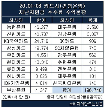 자료에 따르면 1차 재난지원금 지급 당시 카드 이용으로 카드사들이 거둔 수수료 수익이 1967억4800만 원인 것으로 나타났다.