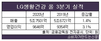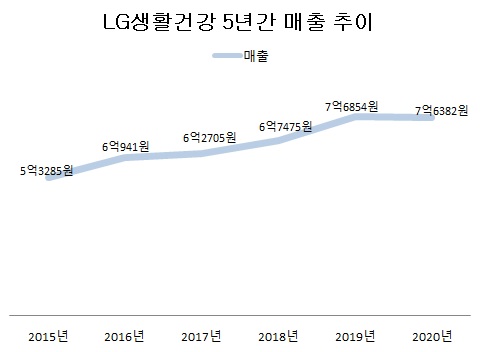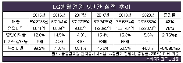 LG생활건강의 실적 추이를 살펴보면, 2015년 5조3285 억 원으로 5조 원대 그쳤던 매출은 2016년에 6조 원(6조941억 원)을 돌파했다. 이후 2017년 중국의 사드(THAAD·고고도미사일방어체계) 보복에도 불구하고 6조2705억 원을 기록하며 성장세를 이어 나갔으며 2018년 6조7475억 원, 2019년 7조6854억 원을 기록했다. 올해는 코로나19로 인한 경기침체‧소비위축에도 3분기 전년 동기 대비 1.4% 증가한 5조7501억 원을 기록했다.