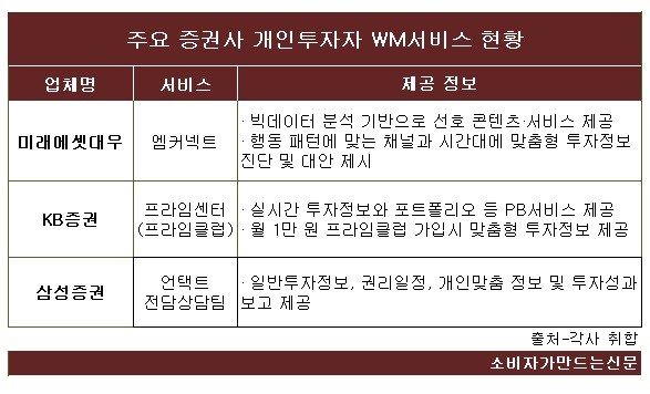 WM(Wealth Management)는 통상 예금 대출은 물론 주식 세무 법률등을 통합한 자산관리서비스를 뜻한다. 그동안은 고액의 자산가 중심으로 이같은 서비스를 제공해 왔으나 개인 투자자들 유입에 따라 자산규모와 관계 없이 WM서비스를 제공하며 고객을 끌어들이고 있다.
