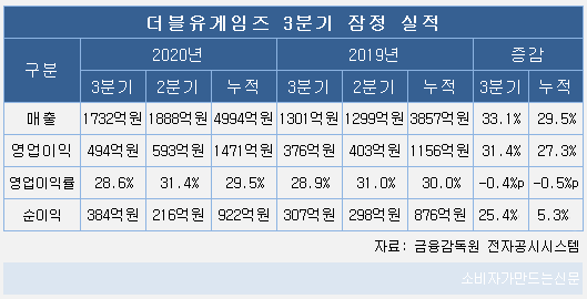 28일 금융감독원 공시에 따르면 더블유게임즈의 3분기 매출은 연결 재무제표 기준 1732억 원으로 전년동기 대비 33.1% 증가했다. 영업이익은 494억 원으로 31.4% 늘었고 순이익도 384억 원으로 25.4% 성장했다.